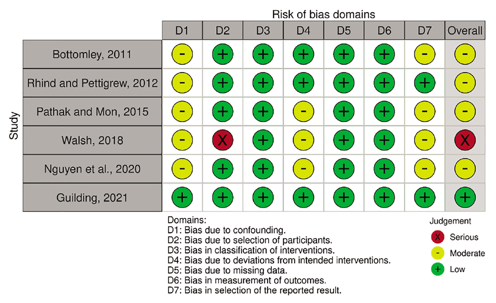 This systematic review and meta-analysis included 6 studies (k = 6, n = 1,571) from four countries (Australia, Malaysia, New Zealand and the United Kingdom). The studies were published between 2011 and 2021. The population comprised undergraduate students studying medicine, veterinary sciences, dentistry and biomedical sciences. The detailed characteristics of the included studies are summarised in Table 1. The risk of bias analysis revealed that one study was rated as having a low risk, while four had a moderate risk, and the remaining study was classified as having a high risk. The results of the ROBINS-I can be found in Figure 2.