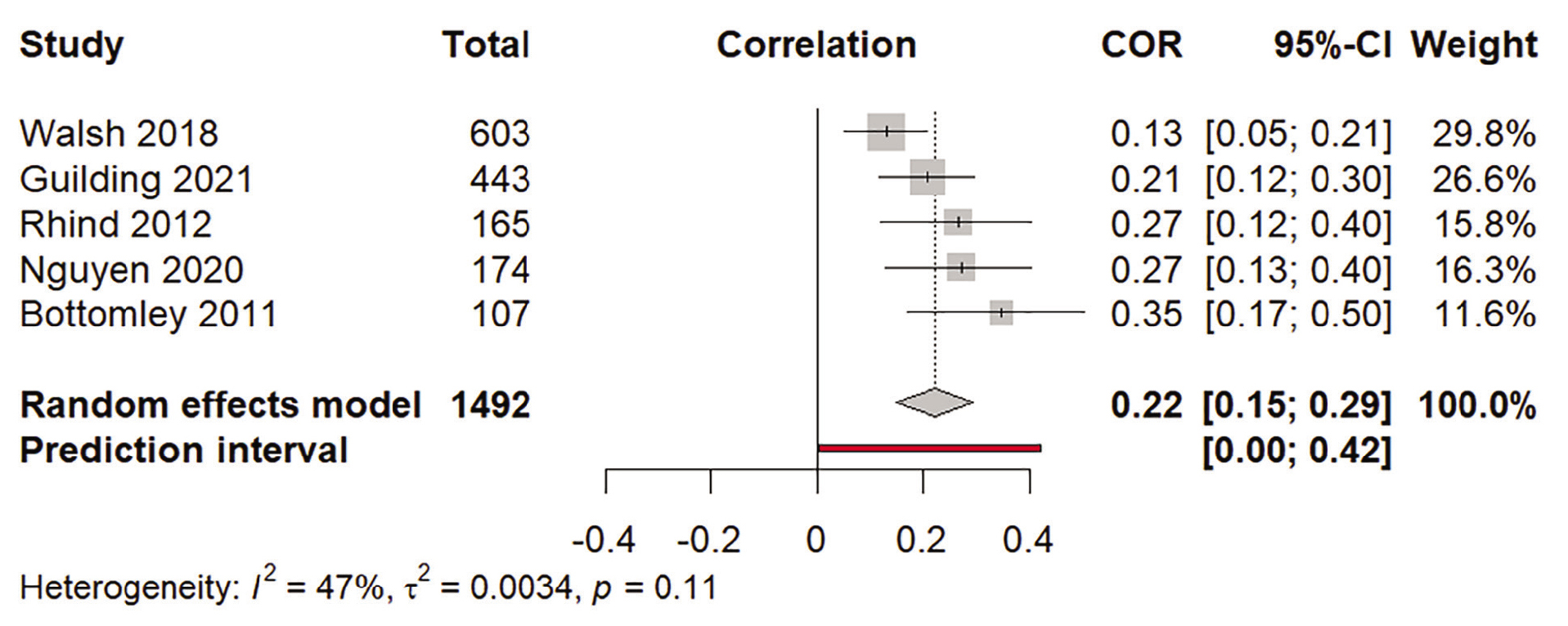 The A Der Simonian and Laird random-effects meta-analysis without Hartung – Knapp adjustments was performed on the results of the systematic review using the metacor function in R statistical software version 4.4.1. A random-effects model was chosen as there was an anticipated heterogeneity between studies, leading to the probability that there is not one true effect size, but a distribution of effect sizes influenced by variance in intervention, population and methodology.
