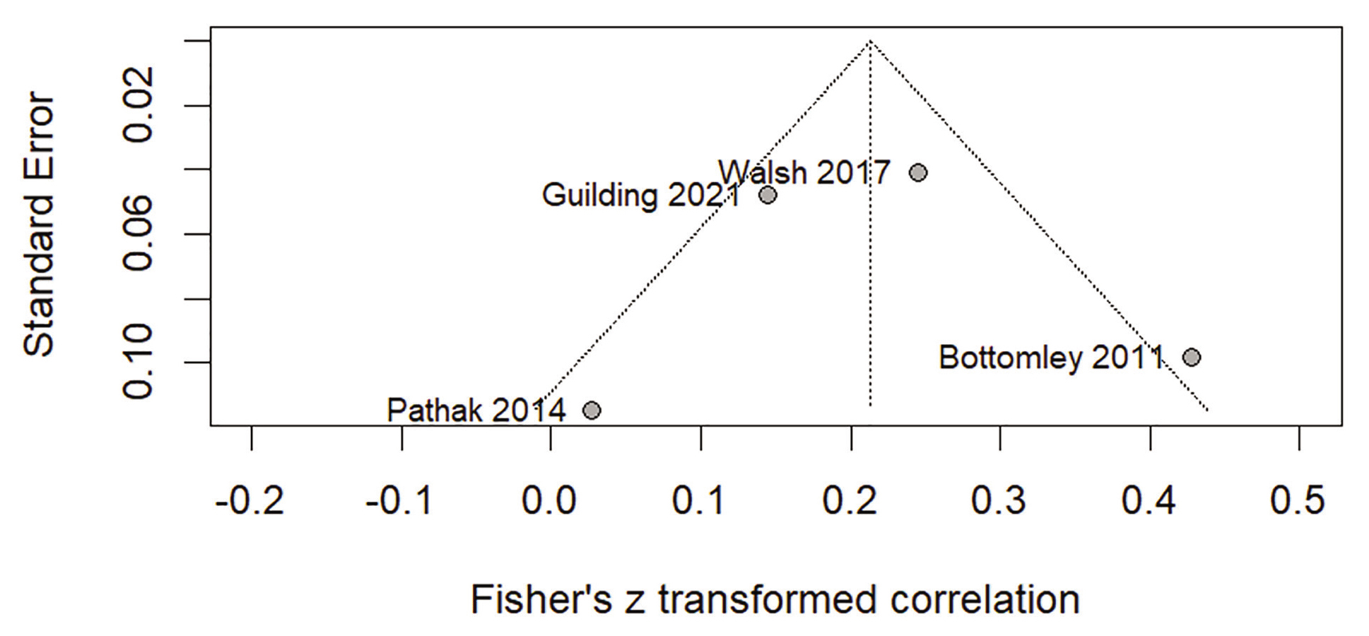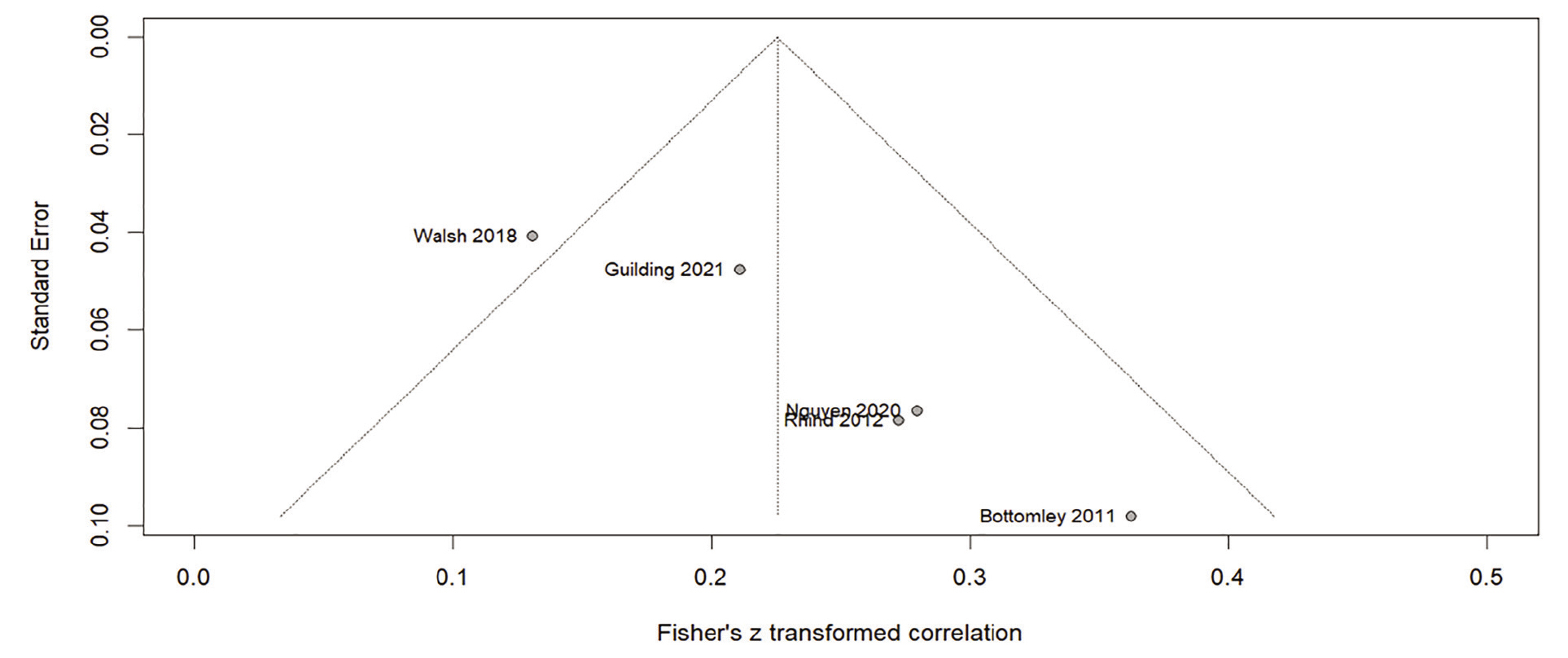 A total of k=5 studies analysed the impact of answering peer-made question banks on summative performance. The pooled correlation coefficient was 0.22 (95% CI: 0.15 to 0.29, p<0.0001), as shown in Figure 3. The Q-test revealed moderate to low heterogeneity of the outcomes (Q(4)=7.59, p<0.1078, Tau2=0.0034, I2=47.3%). A 95% prediction interval for the actual outcomes was 0.00 to 0.42. Calculation of the standardised residuals showed that Walsh, et al. (2018) had a value more significant than 2.00 and might be an outlier in this model. Cook's distances, including Walsh, et al. (2018) ( 20 ) (Cook’s distance=0.5), demonstrated that none of the studies had a significant impact. A sensitivity analysis was performed excluding this study. The pooled correlation coefficient was 0.25 (95% CI: 0.19 to 0.31,p<0.0001), as shown in Figure 4. The Q-test revealed low heterogeneity of the outcomes (Q(3)=2.2, p<0.53, Tau2=0, I2=0%). A 95% prediction interval for the actual outcomes was 0.11 to 0.38. The sensitivity analysis, excluding Walsh, et al. (2018) ( 20 ) confirms the robustness of the findings and provides a more precise estimate, showing a slight increase in the pooled effect size and elimination of heterogeneity. Visual inspection of the funnel plot did not show asymmetry that would suggest publication bias (see Figure 5).