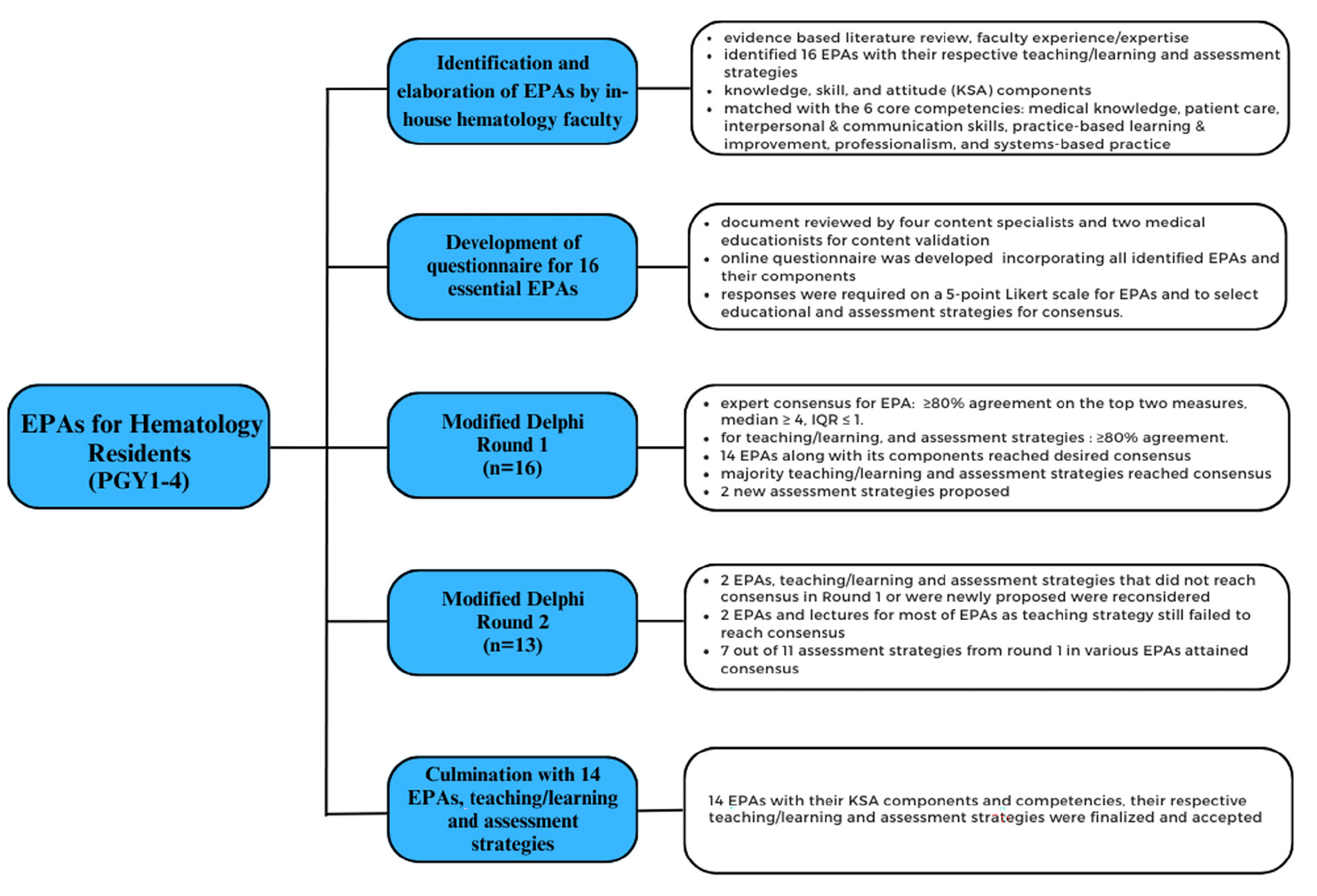 Conclusions: The study identified essential EPAs, competencies, and effective teaching and assessment strategies. This collaborative effort advances hematology medical education and guides curriculum development, preparing competent hematologists for the unique context of the Pakistani and related healthcare systems.