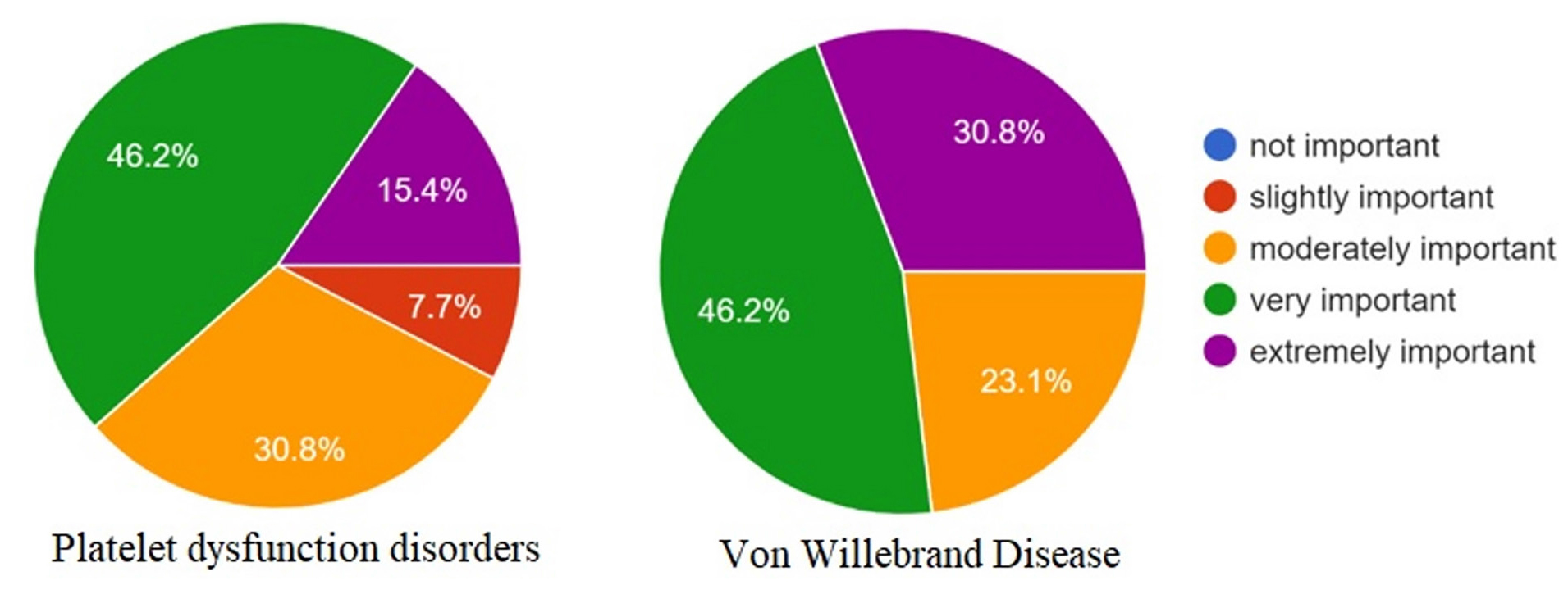 At the conclusion of the second round, the EPAs that had previously struggled to achieve consensus still fell short of meeting the prescribed acceptance criteria. These two EPAs encompassed Platelet Function Disorders (PFDs): Diagnosing Qualitative Platelet Disorders for resident PGY-1 and Von Willebrand Disease (VWD): Diagnosing Willebrand Disease for resident PGY-2. Despite being deemed 'very important' by the majority of participants, the overall percentage agreement for both EPAs fell below the acceptable cut-off of 80%. This finding is particularly unexpected in the case of VWD, the prevalent inherited bleeding disorder. It narrowly missed meeting the acceptable criteria at 77%. It is conceivable that the criteria for acceptance were stringent (≥80%); perhaps, adding a couple of more expert reviewers might have pushed the results beyond the threshold for acceptance. Another possible explanation may be the absence of testing facilities for Von Willebrand Disease and Platelet Function Testing, which are not commonly available at institutions engaged in PG training in Pakistan. In contrast, a different specialized service, thrombophilia screening, successfully attained the targeted consensus. In 2019, the World Federation of Haemophilia (WFH) disclosed that 195,263 people were diagnosed with hemophilia in 115 countries. Pakistan accounted for over 2000 of these cases. However, this figure might not provide an accurate depiction of the true scenario, as several studies have highlighted a considerable occurrence of bleeding disorders in the country ( 19 , 20 ). Indeed, von Willebrand Disease (type 3) was found to be the most prevalent inherited autosomal recessive bleeding disorder, accounting for 34% of cases ( 19 ).