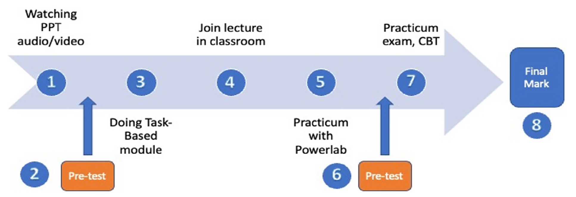was conducted to gather students’ insights into how PowerLab can be utilized to perform and educate physiology experiments. A task-based module was used in this study, implemented over five sessions, each lasting 120 minutes, and covering topics such as cardiovascular, respiratory, and neuromuscular physiology. Students’ cognitive abilities were measured using a pre-post-test consisting of 25 validated multiple-choice questions, a practicum exam, and the final mark of the biomedical course. Data were analyzed using SPSS version 26.0 and Microsoft Excel. Frequency and summary statistics were analyzed using descriptive statistics.