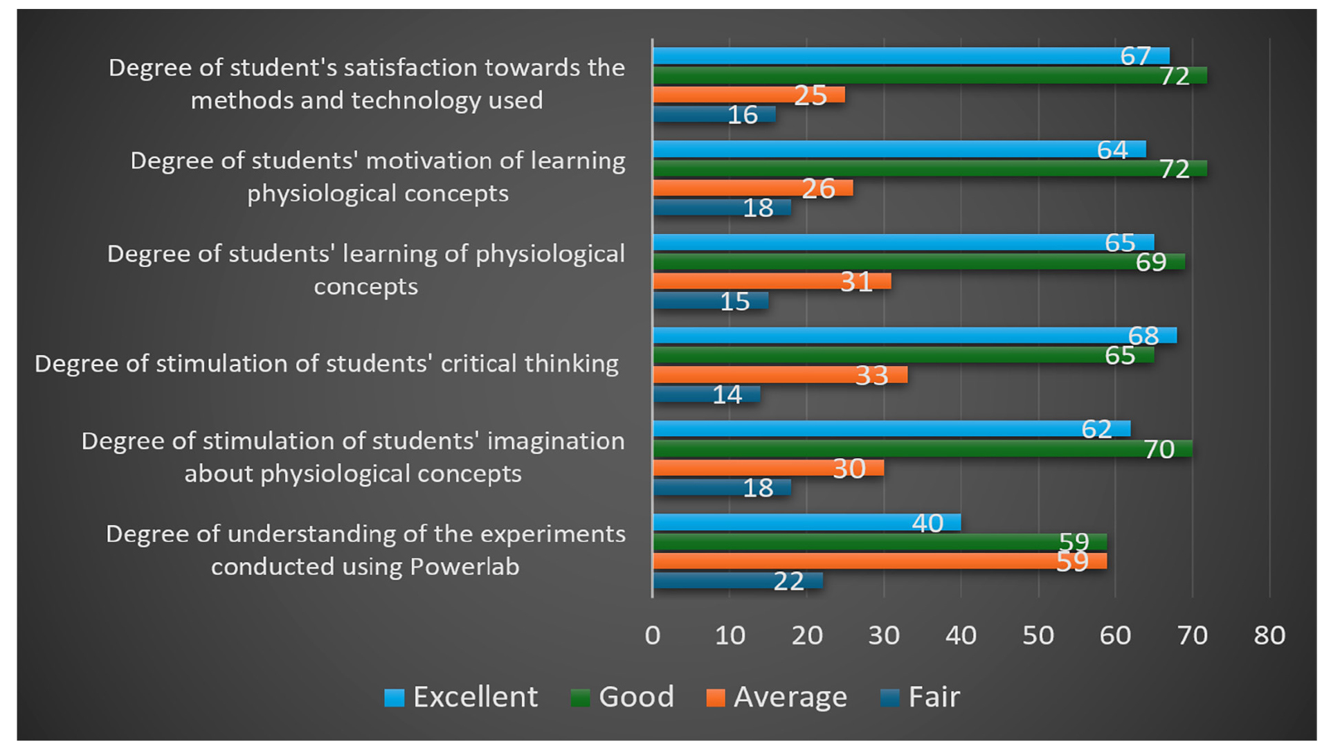 Figure 2 presents the survey results related to students' satisfaction, motivation, and learning outcomes in their study of physiological concepts. The majority of students (67%) rated their satisfaction as "Excellent," followed by 25% "Good." Most students (64%) felt highly motivated, with 26% indicating "Good." A strong majority (69%) rated learning experiences "Excellent," with 31% selecting "Average." However, comprehension of PowerLab experiments showed greater variation, with 40% reporting only "Average" understanding, indicating discrepancies between the students' satisfaction and their perceived comprehension of the experimental concepts.